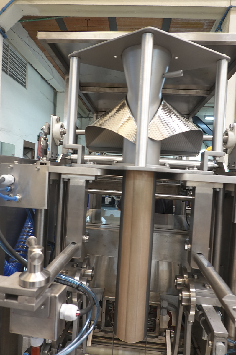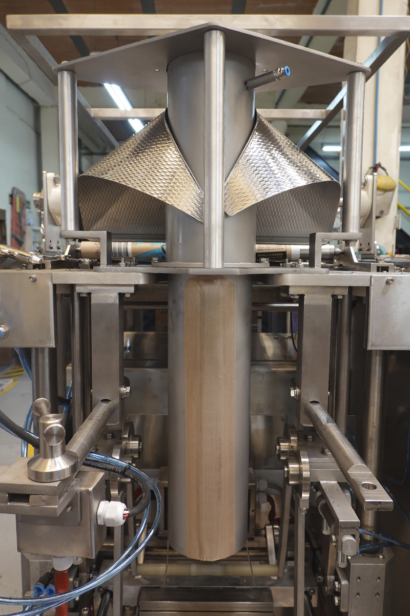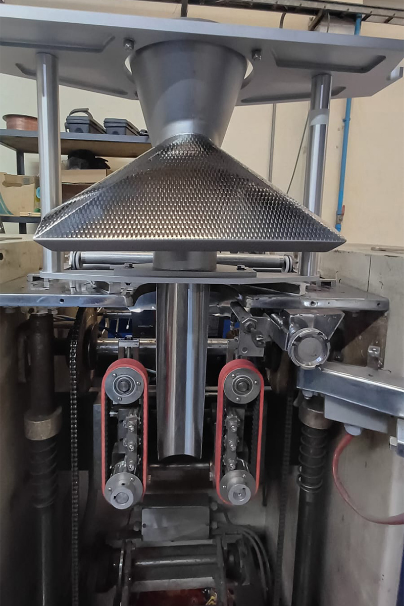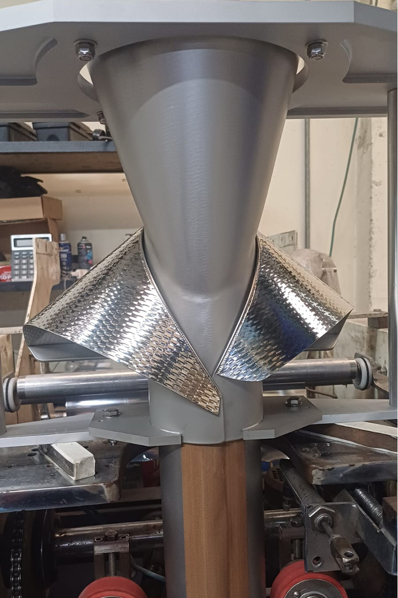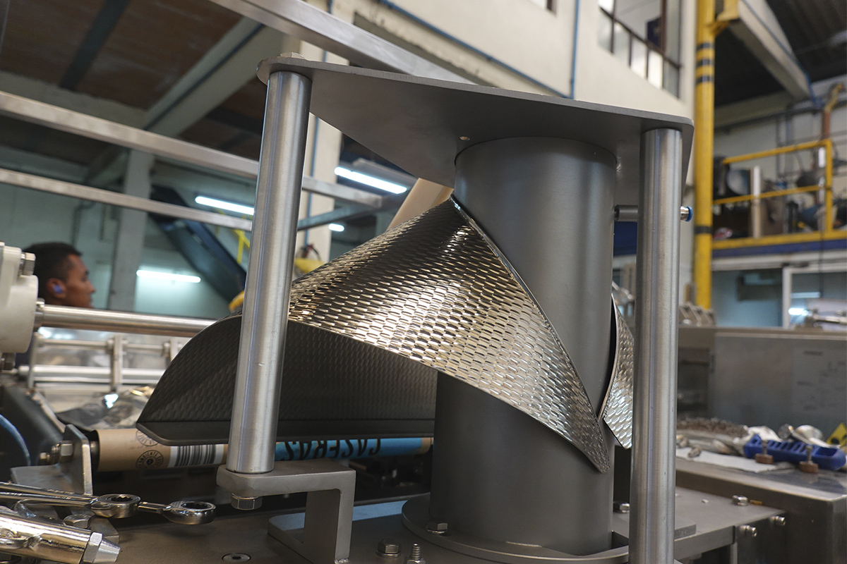 Su función es fundamental: el formador es el encargado de dar forma cilíndrica a la película de empaque, preparándola para que sea llenada con el producto y sellada con precisión.